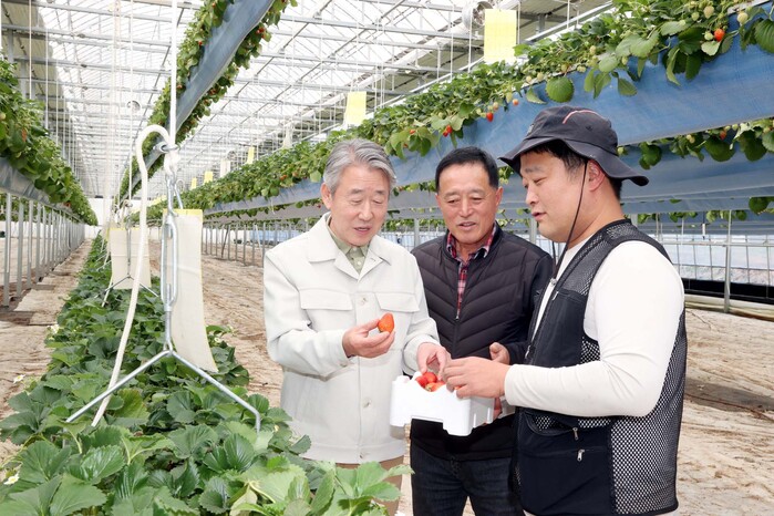 강호동 농협중앙회장은 4일 대구 달성군 소재 딸기 스마트팜(델리베리 딸기농원,대표 황희재)을 찾아 농업·농촌 변화와 혁신의 주역인 청년농업인과 소통의 시간을 가졌다.