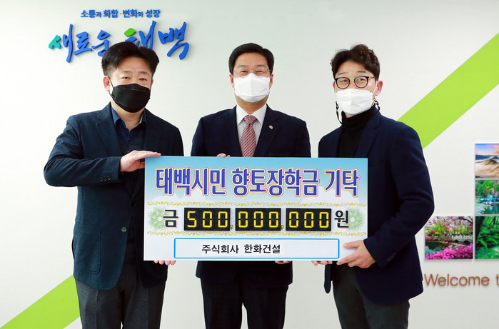 [로컬세계 박상진 기자]강원 태백시는 21일 ㈜한화건설이 시청을 방문해 (재)태백시민향토장학회에 지역교육 발전과 인재 육성을 위한 장학금 5억원을 기탁했다고 밝혔다.