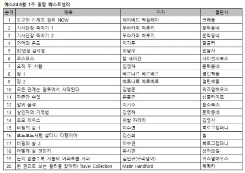 ▲예스24 8월 1주 베스트셀러 순위.(YES24 제공) |