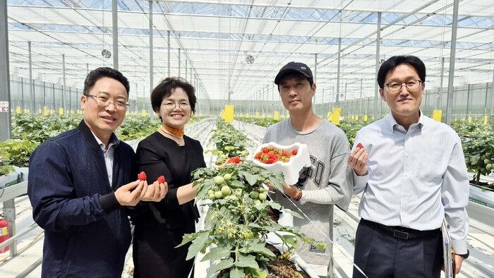 ▲농신보 조은주 상무(왼쪽에서 2번째)가 21일 충북 괴산군 소재 스마트팜 딸기농가에서 수확한 딸기와 함께 기념촬영을 하고 있다. |