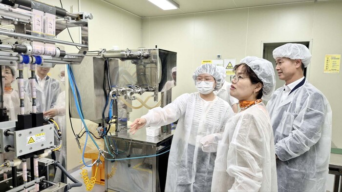 ▲농신보 조은주 상무(왼쪽에서 2번째)가 23일 강원 춘천시 소재 농업회사법인 (주)강원양봉에서 벌꿀 가공 공정에 대한 설명을 듣고 있다. 농협 제공 |