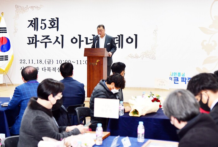 아너스데이는 파주시가 이웃에 나눔을 실천한 관내 유공자를 초청해 감사의 마음을 전하고 그들을 예우하는 자리로, 코로나19 재확산에 따라 이웃과 나눔을 실천한 유공자 및 관계자 50여 명만 참석한 가운데 간소하게 열렸다.
