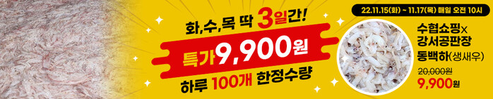 수협쇼핑은 오는 15일부터 17일까지 3일간 김장용 생새우인 동백하 1kg 한상자를 9,900원에 무료배송으로 판매한다고 밝혔다.