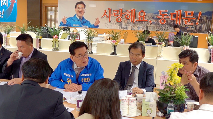 ▲유덕열 동대문구청장 후보가 10일 오전 서울 제기동 선거사무소에서 기자회견을 갖고 있다.(유덕열 후보 선거캠프 제공) |