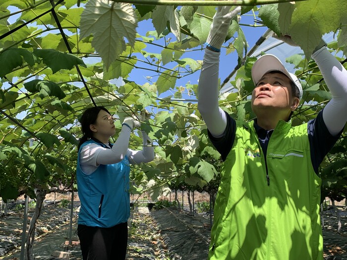 이날 운동본부 임직원, 농협대학교 학생봉사단 ‘늘봄’ 30여명과 인천 강화지역 농협 임직원도 함께 참여해 포도알 솎기 및 과수원정리 작업 등을 실시하여 농가의 일손을 거들었다.