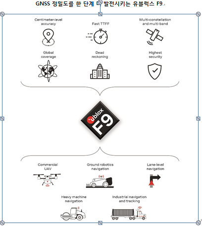 이 플랫폼은 멀티밴드 글로벌위성항법시스템(GNSS) 기술·추측항법·고정밀 알고리즘·GNSS 보정 데이터 서비스 호환기술들을 결합해 센티미터(cm) 수준의 고정밀도를 구현한다. 유블럭스 F9은 차세대 고정밀 내비게이션·증강 현실·무인 차량 기술 개발의 길을 열어줄 것이다.