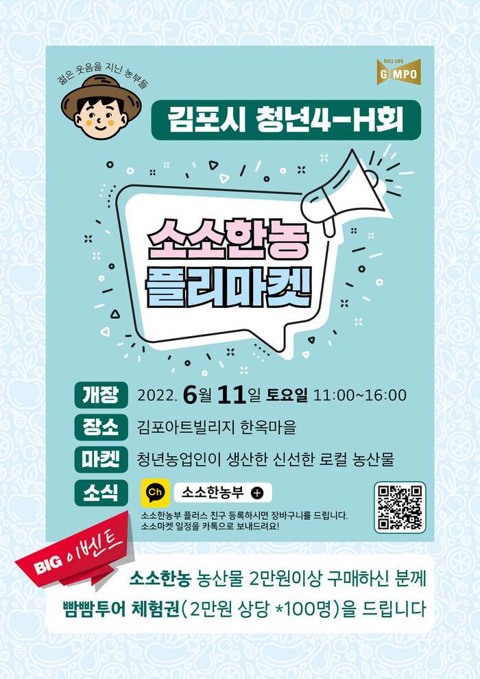 [로컬세계=김병민 기자] 경기 김포시는 청년농업인이 생산한 농산물 직거래 장터인 ‘소소한농 플리마켓’을 오는 6월 11일(토) 11시부터 운양동 아트빌리지 한옥마을에서 개장한다고 밝혔다.