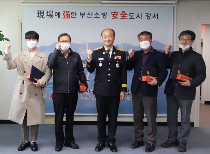 [로컬세계 맹화찬 기자]부산 강서소방서는 최근 화재가 발생한 노후주택 현장에서 소방대가 도착하기 전 주택용소방시설인 소화기로 초기 화재진화와 인명대피를 유도한 시민들에게 1일 강서소방서 서장실에서 의인상 시상식을 가지고 표창장과 부상품을 전달했다고 2일 밝혔다.
