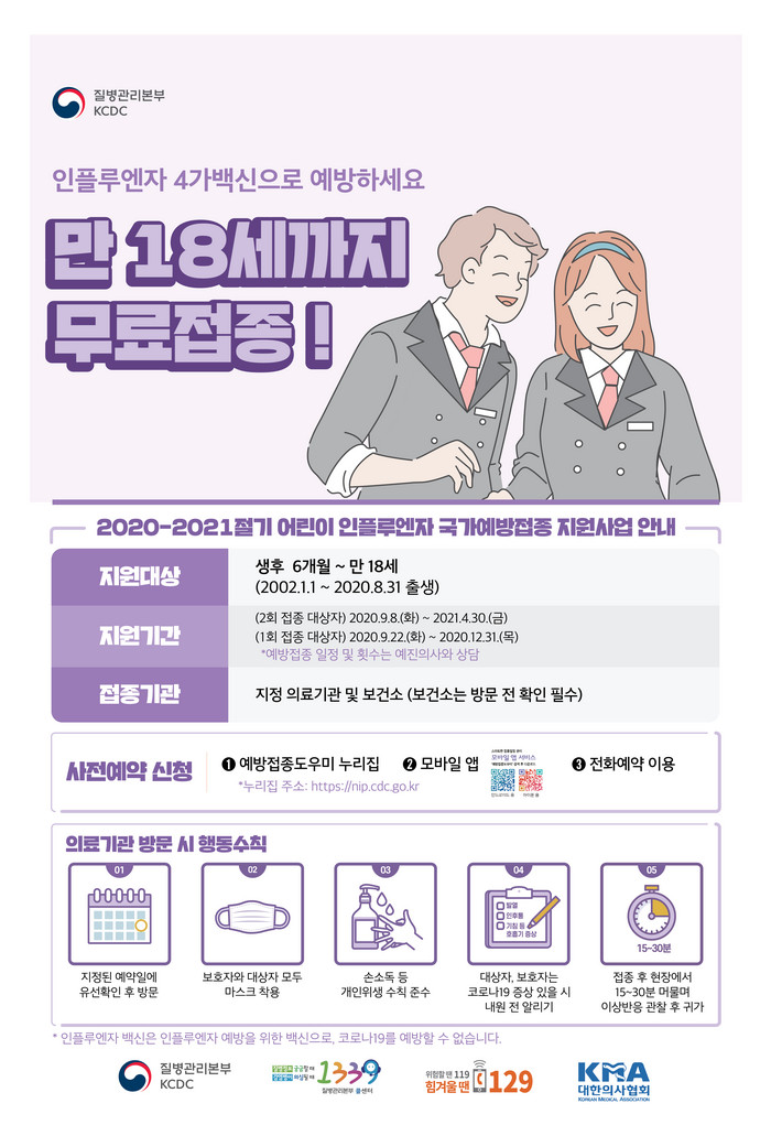 국가예방접종 지원사업 대상자인 만 18세 이하 어린이 및 임신부는 보건소 외 가까운 지정의료기관(어린이 59개소, 임신부 33개소)에서 무료로 접종이 가능하다.