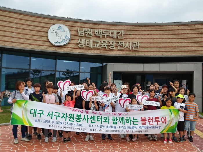 이날 대구시 서구자원봉사센터 가족봉사단은 아영면 내인마을을 찾아 포도순 접기 자원봉사로 값진 땀을 흘리고 운봉을 찾아 지리산허브밸리, 백두대간전시관, 황산대첩비, 송흥록·박초월 생가 등을 둘러보며 지리산의 정취와 남원시의 역사문화를 체험하는 투어로 일정을 마무리했다.