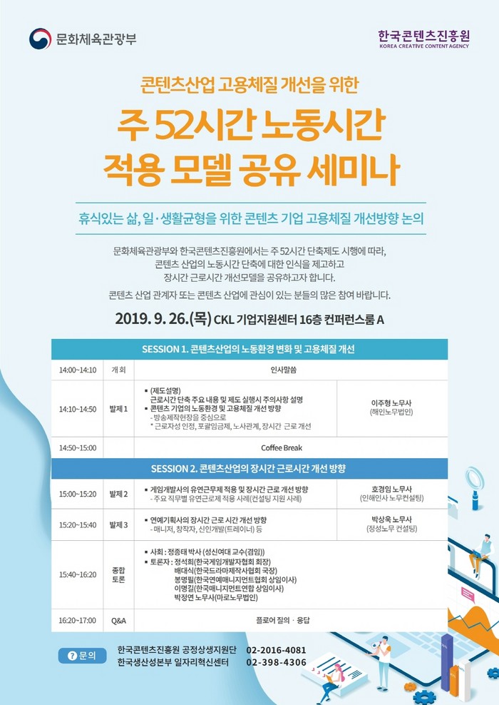 [로컬세계 길도원 기자]문화체육관광부(장관 박양우)와 한국콘텐츠진흥원(원장 김영준, 이하 콘진원)은 콘텐츠산업 고용체질 개선을 위해 ‘주 52시간 노동시간 단축제도 정착을 위한 적용모델 공유세미나’를 9월 26일 광화문 CKL기업지원센터에서 개최한다.