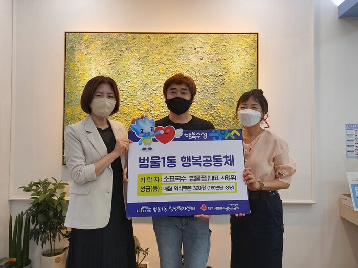 [로컬세계=박세환 기자] 대구 수성구 소표국수 범물점(대표 서영우)은 지난 22일 범물1동 행정복지센터를 방문해 저소득 아동과 어르신들을 위해 매월 무료외식 쿠폰 300장(180만원 상당)을 범물1동 행복공동체에 전달했다.