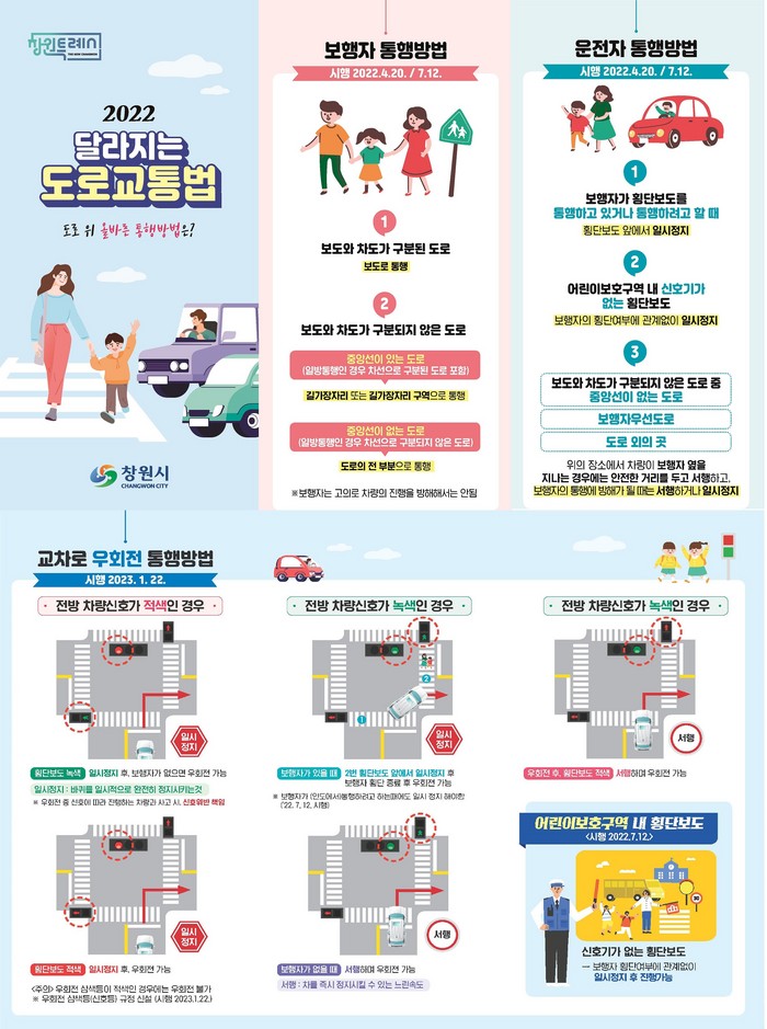 [로컬세계 한용대 기자]경남 창원시(시장 허성무)는 개정된 도로교통법으로 인해 보행자 보호의무가 강화됨에 따라 올바른 도로교통법 개정 내용을 알려 운전자의 법규 준수를 독려하고 보행자 교통사고를 예방하기 위해 ‘2022년 달라지는 도로교통법’에 대한 홍보물을 제작·배포한다고 17일 밝혔다.