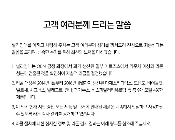 | ▲씰리침대 사과문.(출처=씰리 침대 홈페이지 캡처) |