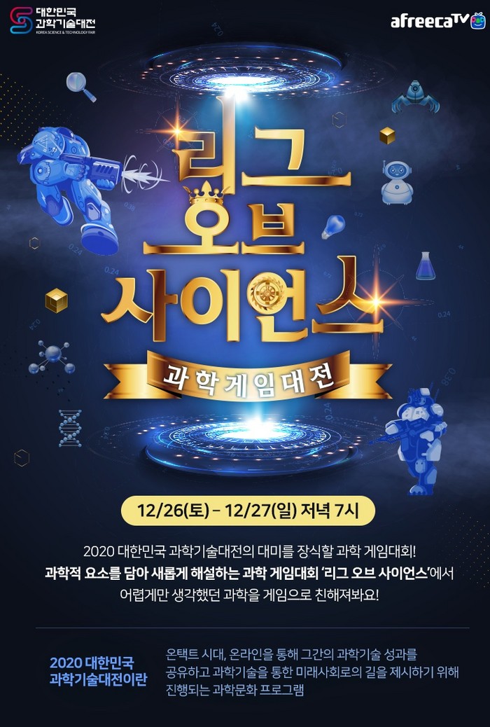아프리카TV는 ‘2020 대한민국 과학기술 대전’ 마지막 이틀인 12월 26일(토)과 27일(일) 양일간 서울 잠실 ‘핫식스 아프리카 콜로세움’에서 과학 게임 대전 프로그램인 ‘리그 오브 사이언스’를 개최한다고 밝혔다.