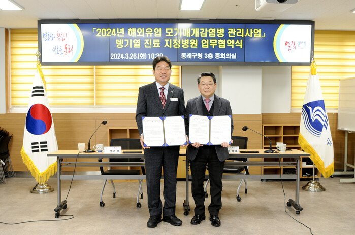[로컬세계 부산=맹화찬 기자]부산 동래구(구청장 장준용)는 지난 26일 지역사회 내 모기매개감염병(뎅기열) 환자 진단·치료를 위해 대동병원(병원장 이광재)과 지정병원 협약을 체결했다고 밝혔다.