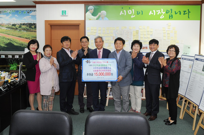 시에 따르면 오산의료소비자생활협동조합, 더우리소비자협동조합, 남촌동주민자치위원회가 지난 10일 시청을 방문해 저소득가구 지원을 위한 이웃돕기 후원성금 1500만원을 전달했다.