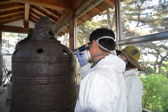 또한 야외전시 금속유물의 보존을 위한 보호코팅은 정기적으로 진행하는 사업으로서 이번 보존처리는 시립박물관 야외 종각에서 진행됐다.