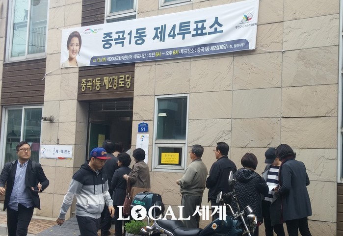 ▲서울시 광진구 중곡1동 제2경로당에서 시민들이 투표를 하기 위해 줄을 서며 기다리고 있다. 라안일 기자. |
