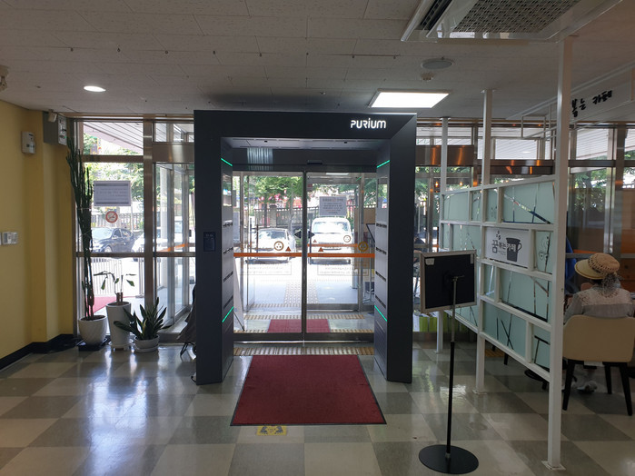 | ▲옷에 묻은 먼지 제거 등의 효과가 있는 스마트 에어샤워 설치한 성남시 황송노인종합복지관. 성남시 제공 |