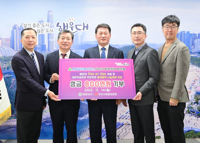 [로컬세계 부산=손영욱 기자] 현대글로벌서비스(대표 이기동)와 HGS 협력회사협의회(회장 강병춘)는 지난 14일 해운대구(구청장 김성수)에 성금 800만원을 기탁했다고 해운대구가 21일 밝혔다.