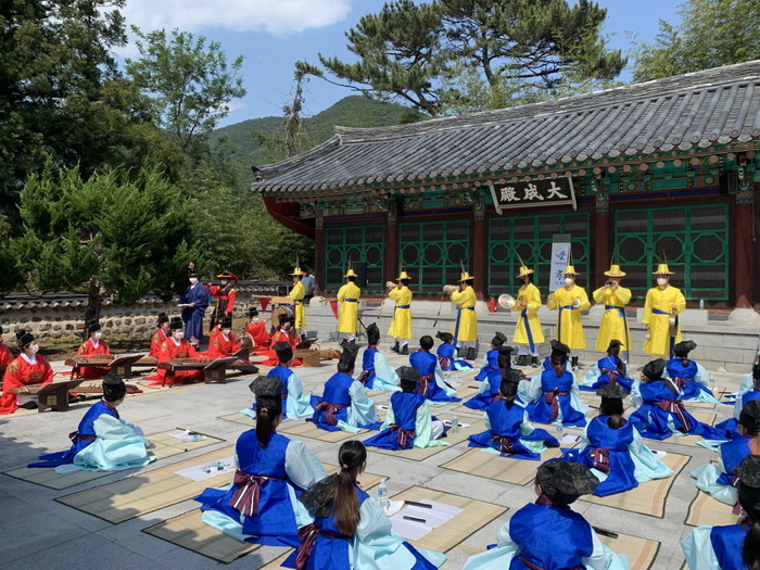 이날 참여한 학생들은 유생복으로 환복 후 전래놀이, 떡메치기를 체험했다. 그리고 대성전 앞뜰에서 국악단의 연주를 배경으로 ‘어머니와 효’를 주제로 한 과거시험을 재현했다.