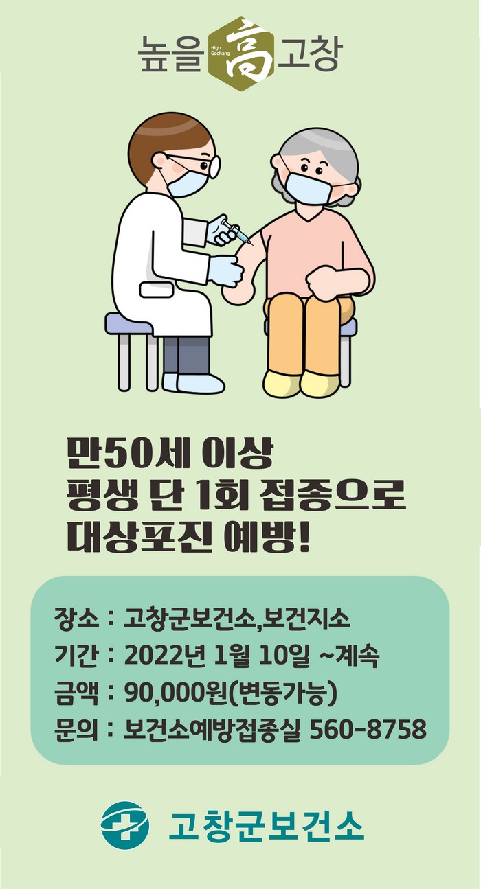 고창군은 대상포진 발병률 감소와 조기예방으로 의료비 부담 경감을 위해 2019년부터 보건소에서 백신 구입 가격으로 접종을 실시하고 있다.