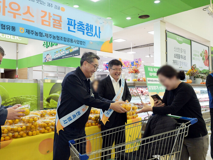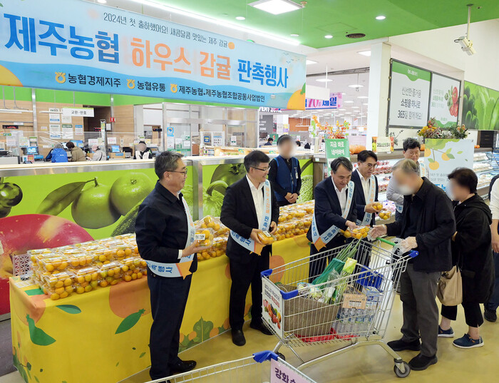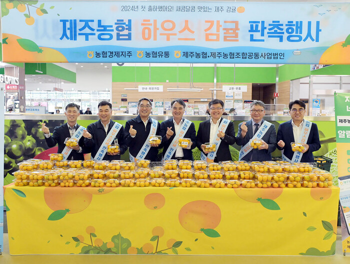 이날 '하.하.하. 하우스 감귤 판촉 행사'에서는 고일학 의장조합장(제주농협조합공동사업법인), 박진석 대표(제주농협조합공동사업법인), 정기철 조합장(서귀포농협) 등 산지 관계자들이 참석해 고품질 하우스 감귤의 신선함과 좋은 맛을 판촉 했다.
