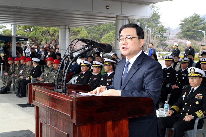 | ▲25일 해군교육사령부 대연병장에서 열린 해군입영문화제에서 허성무 창원시장이 인사말을 하고 있다.(창원시 제공) |