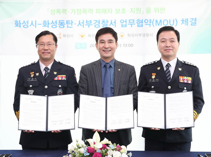 | ▲가정폭력 피해 예방 업무 협약 기념촬영 모습. 왼쪽부터 김병록 동탄경찰서장. 서철모 화성시장. 윤후의 서부경찰서장.(화성시 제공) |