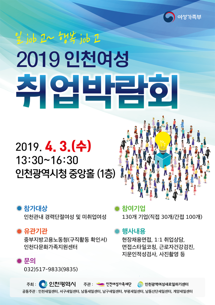 [로컬세계 이민섭 기자]인천시와 광역여성새로일하기센터(인천여성가족재단)는 인천관내 7개 새일센터와 공동주관으로 오는 3일부터 인천시 중앙홀에서 취업을 희망하는 여성을 대상으로 '2019 인천여성 취업박람회'를 개최한다.