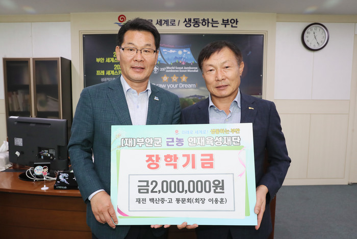 재전 백산중·고동문회는 17일 부안군 근농인재육성재단에 부안군 인재육성 및 교육환경개선을 위한 장학금 200만원을 기탁했다.