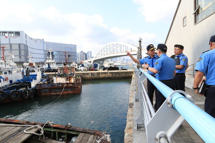 [로컬세계 부산=김의준 기자]남해지방해양경찰청 채광철 청장은 지난 7일고 8일 이틀에 걸쳐 육상과 해상에서 예선과 부선이 밀집한 영도 봉래동 물양장을 찾아 선박들의 계류상태와 선박현황, 태풍비상근무 거점 사무소 등을 점검했다.