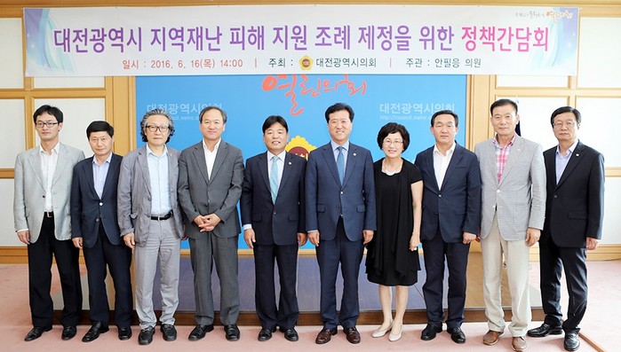 [로컬세계 조윤찬 기자]안필응 대전시의원(새누리.동구3)은 16일 대전시의회 대회의실에서 ‘대전시 지역재난 피해 지원 조례 제정 방안 모색을 위한 정책간담회’를 개최했다.