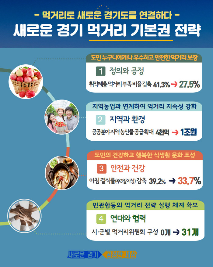 도는 이번 전략을 통해 ‘새로운 경기, 먹거리 기본권’을 슬로건으로 정책 브랜드화 해 향후 5년간 추진 할 4가지 핵심 목표를 제시했다.