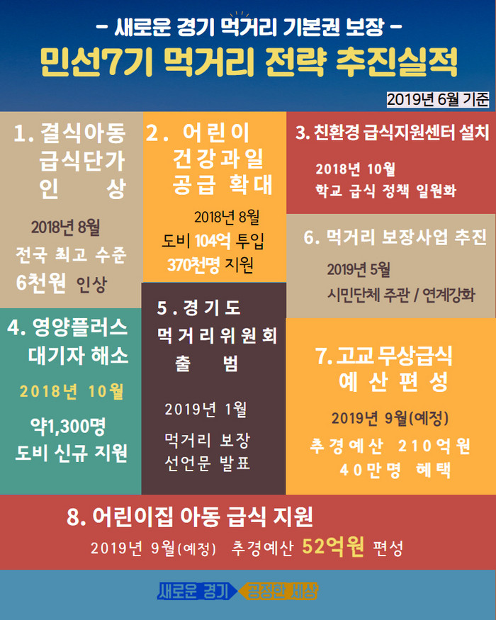 또 임산부와 영유아에 대한 맞춤형 영양지원 사업인 ‘영양플러스 사업’ 대기자 해소를 위해 도비를 신규 편성해 지원했으며, 시민사회 스스로 먹거리 취약계층을 돌보는 ‘시민단체 먹거리 보장사업’ 등도 추진하고 있다.