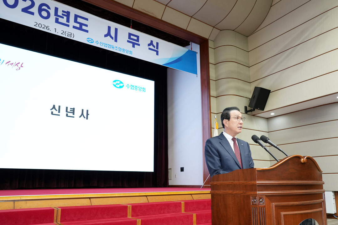 2일 노동진 수협중앙회장이 서울 송파구 본부에서 열린 2026년도 시무식에서 신년사를 하고 있다. 노 회장은 이날 "전국 모든 어업인의 '무사안녕'을 올해 최우선 과제로 삼겠다"는 포부를 밝혔다.