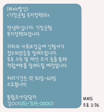 ▲부산 기장군은 사회보장급여 통합조사과정에서 문자 알림서비스인 복지알리미 전송 예시 화면. 기장군 제공 |
