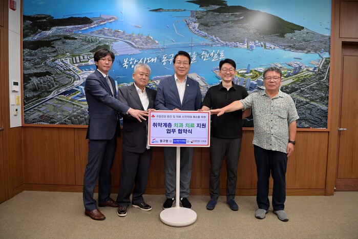 [로컬세계 부산=맹화찬 기자]지난 25일 부산 동구는 구청 소회의실에서 지역 치과 병·의원 두 곳(참상쾌한 치과병원, 편안한 서치과의원)과 ‘취약계층 치과치료 지원 업무협약’을 체결했다고 30일 밝혔다.