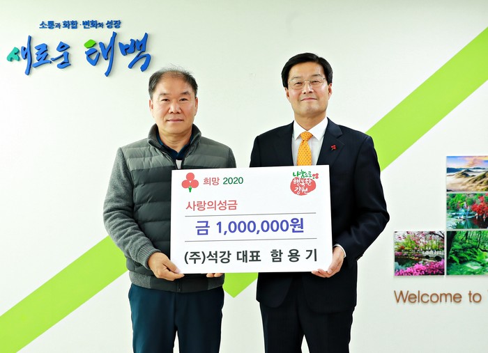 강원 태백시 구문소동 소재 ㈜석강(대표 함용기)의 함용기 대표가 23일 태백시청을 방문, 성금 100만원을 기탁했다. 구문소동 지역사회보장협의체 위원으로 활동하고 있는 함용기 대표는 평소 지역사회의 어려운 이웃들에게 관심을 갖고 나눔과 봉사에 앞장서고 있다.(사진=태백시 제공)