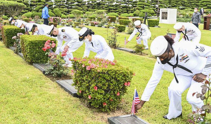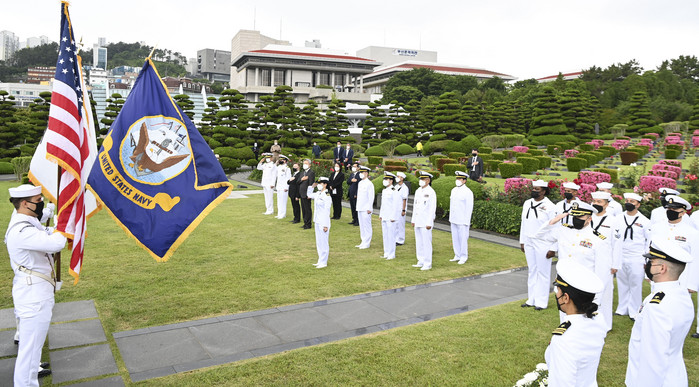 ▲27일 오전 부산 유엔기념공원에서 추모식을 열고 6.25전쟁 당시 대한민국을 지키기 위해 목숨 바친 미군의 희생정신을 기렸다. [해군작전사령부 제공] |