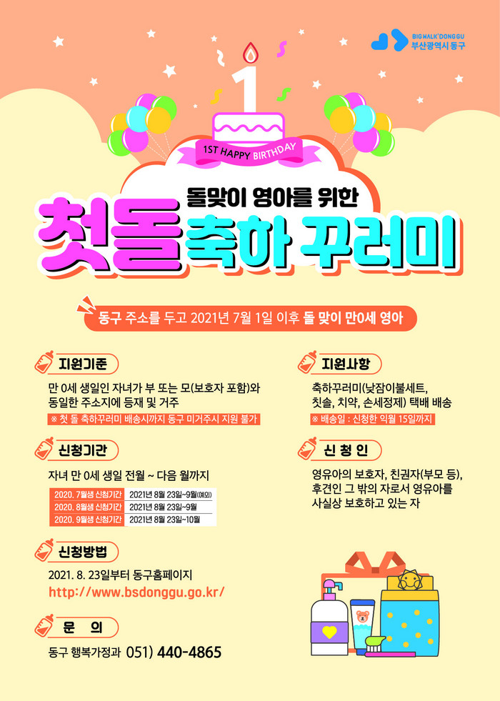 [로컬세계 맹화찬 기자]부산 동구(구청장 최형욱)는 2021년 7월 1일 이후 첫 돌을 맞는 영아에게 10만원 상당 육아용품으로 돌 축하꾸러미를 지원한다고 23일 밝혔다.