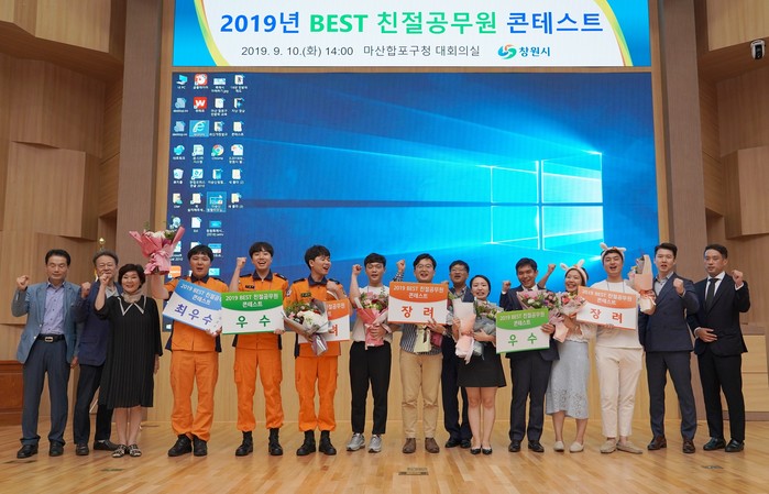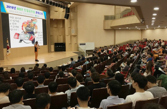 이날 김윤일 창원소방서 신월119안전센터 소방교가 ‘긍정에너지를 발산하라!’ 라는 주제로 발표해 최우수상을 수상해 '2019년 BEST 친절공무원'의 영예를 차지했다.