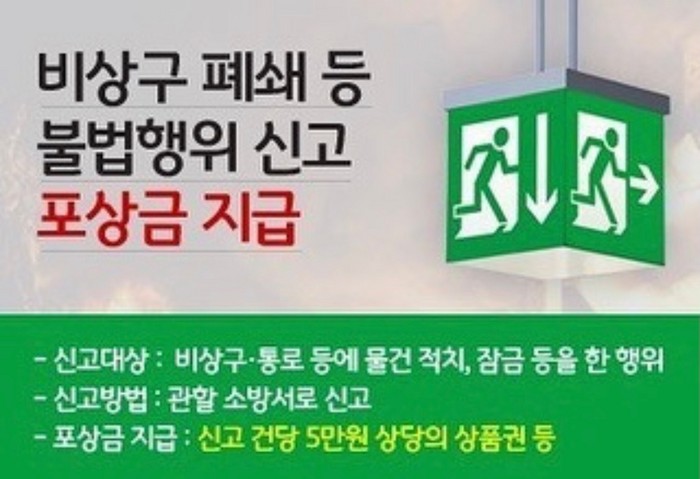 소방서 관계자는 “비상구는 화재 발생 시 개인의 생명을 지킬 수 있는 통로이다”며 “신고포상제로 군민이 자발적으로 피난에 지장을 주는 불법행위를 근절할 수 있는 계기가 되길 바란다”고 전했다.