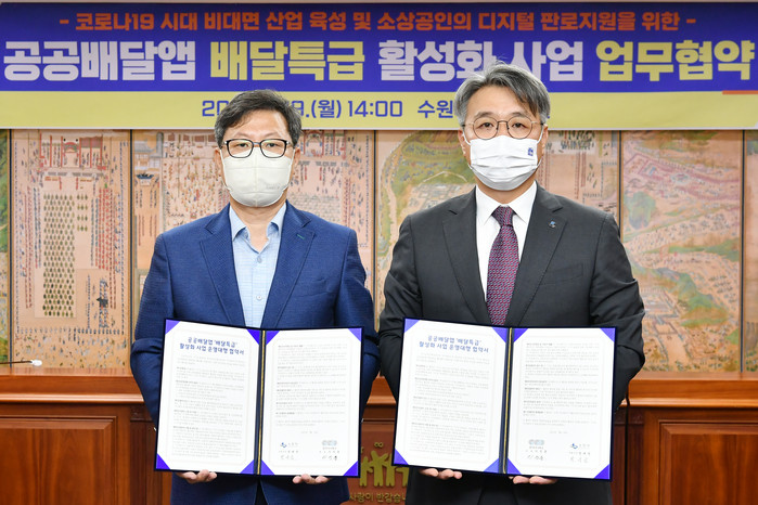 수원시와 경기도주식회사는 19일 시청 상황실에서 ‘공공배달앱 ‘배달특급’ 활성화 사업 업무협약’을 체결하고, 협력을 약속했다.