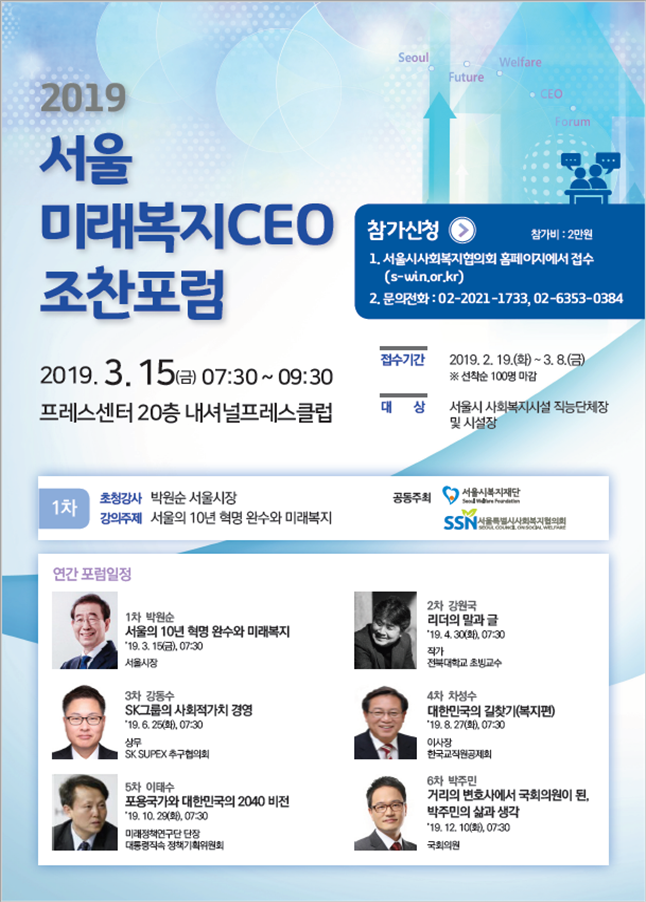 서울시복지재단은 15일 프레스센터 내셔널프레스클럽에서 ‘2019 제1차 미래복지 CEO 조찬포럼’을 개최했다고 15일 밝혔다.