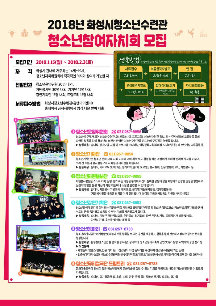 [로컬세계 주덕신 기자]경기 화성시청소년수련관은 청소년들의 자발적인 참여활동을 통해 지역사회 발전에 기여하기 위한 ‘2018년 청소년참여자치회’를 모집한다고 8일 밝혔다.