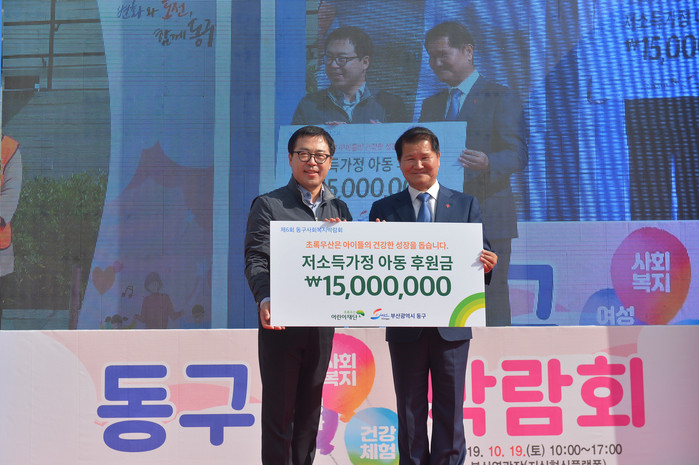 [로컬세계 맹화찬 기자]초록우산 어린이재단 부산지역본부(본부장 여승수)는 지난19일 열린 제6회 동구복지박람회에서 부산 동구(구청장 최형욱)에 후원금 1500만원을 전달했다.