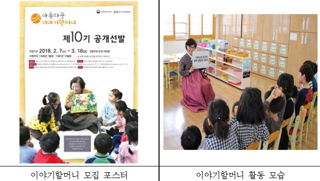 ‘아름다운 이야기할머니’는 전통사회에서 할머니가 손주를 무릎에 앉히고 옛날이야기를 들려주는 무릎교육을 되살림으로써 유아들에게는 올바른 인성을 키워주고, 어르신들에게는 사회 참여 기회를 제공하는 사업이다.