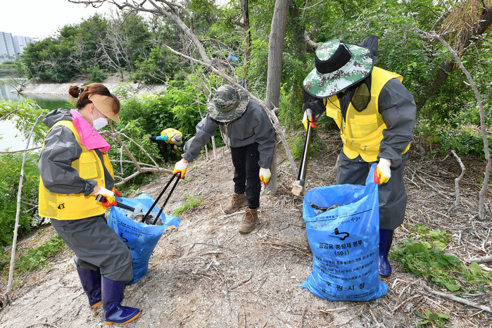 [로컬세계 김병민 기자]경기 수원시가 13일 환경단체와 함께 축만제 내 인공섬에서 정화 활동을 하고, 생태환경을 모니터링했다.